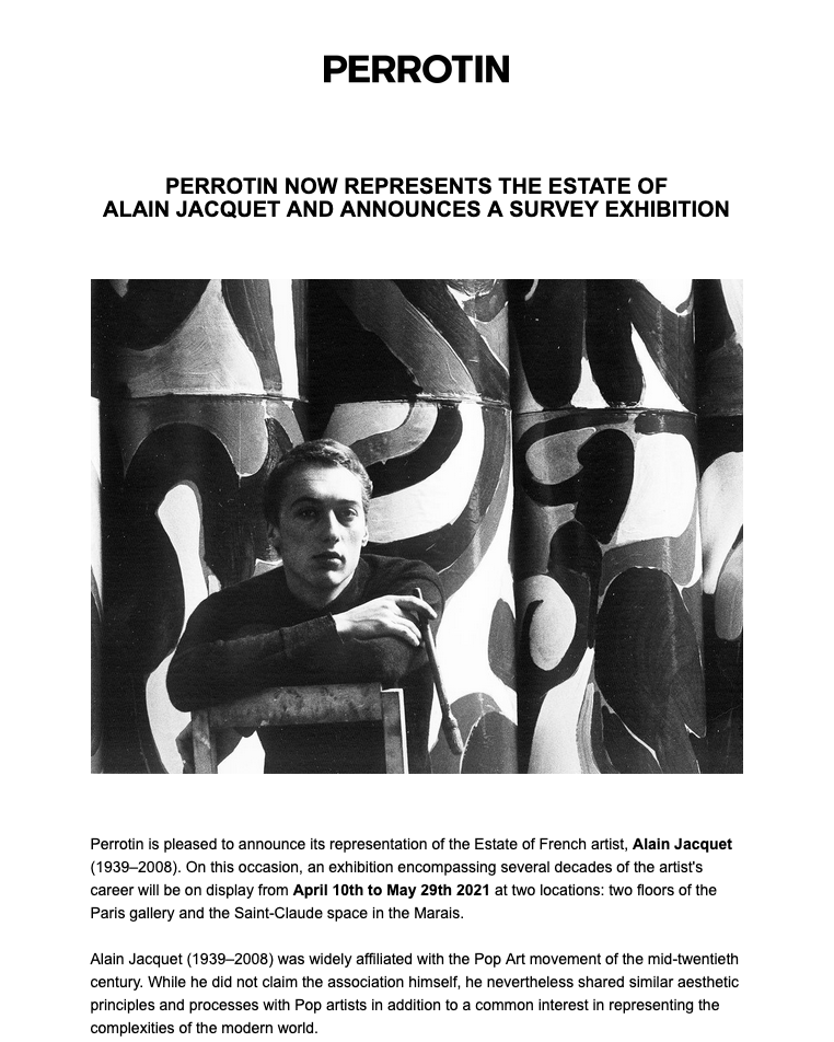 Perrotin announces Representation of the Estate of Alain Jacquet