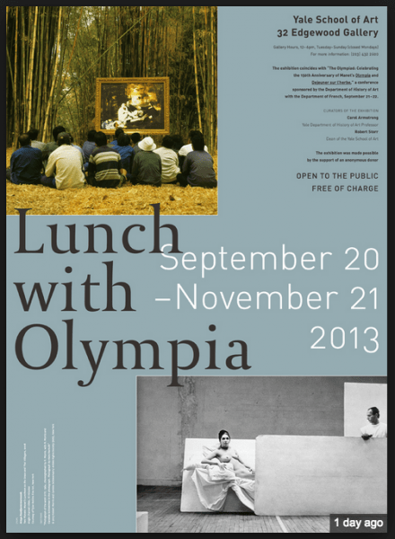 Coinciding with the presentation of the conference “Olympiad: celebrating the 150th Anniversary of Manet’s Olympia and Déjeuner sur l’herbe, the exhibition designed by Carol Armstrong and Robert Storr will present works by Cézanne, Picasso, Robert Morris, Carolee Schneeman, Anthony McCall , and many others of the younger generations.