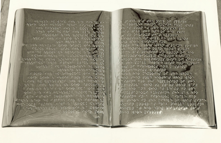With Braille, Alain Jacquet gives us to see, to touch, to read, he lets his creation speak, lets it escape from “confused words” and invites us to hear, by that, the “correspondences” of the World … and his work.