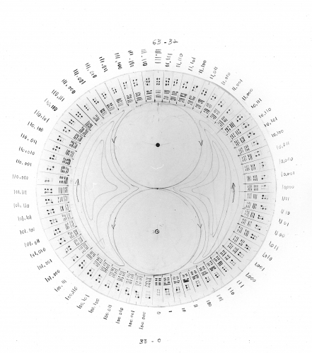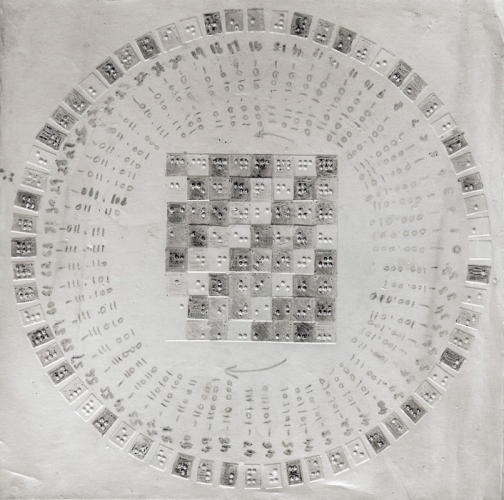 Alain Jacquet will synthesize all these systems and these reflections in his Grande Gaufre, each block of which is a braille version of the 64 hexagrams of the I-Ching. This three-dimensional work is the culmination of his work on braille, both signifier and signified, a perfect circle that would encompass THE meaning and translate it for THE senses.