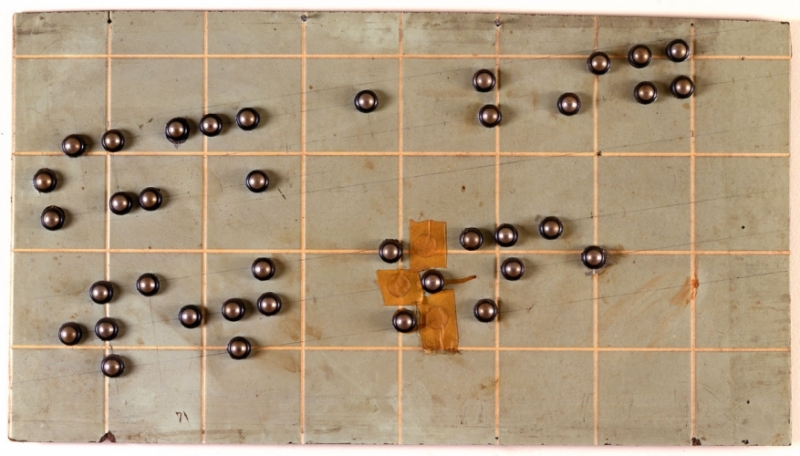 Alain Jacquet’s experiments with the trame point lead him to the braille point. For Helen Keller, the Point is a link with the world; for the blind, the point is a unity of meaning. Everything happens as if the point of Braille contained, in hollow, the world and its meaning. Jacquet dissects the point, dissects it, analyzes it. He cuts it up and fragments it. Up to make it go up in smoke with its Braille Fumes. The point is synecdoche: a “part” which accounts for a “whole”. Le Point is a sphere, a globe, a world …The artist pushes analytical research and the quest for meaning also through games of associations and parallels. He finds in the six points of the braille cell the six colors of his Images of Epinal. His obsessions meet and merge. His work on braille leads him to reflect on the binary system, in particular on the Chinese binary system called I-Ching, and on the question of the masculine / feminine, between alliance and confrontation.