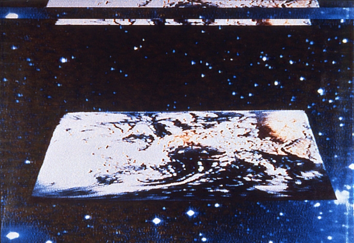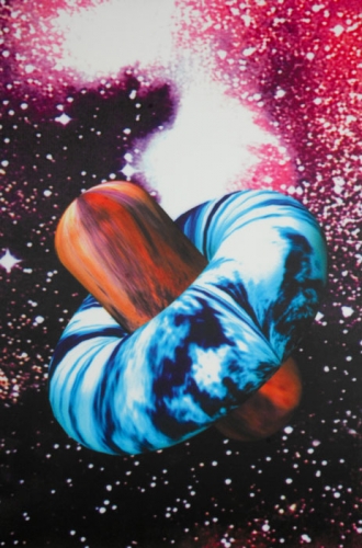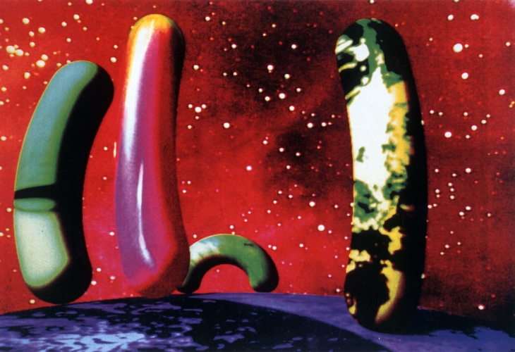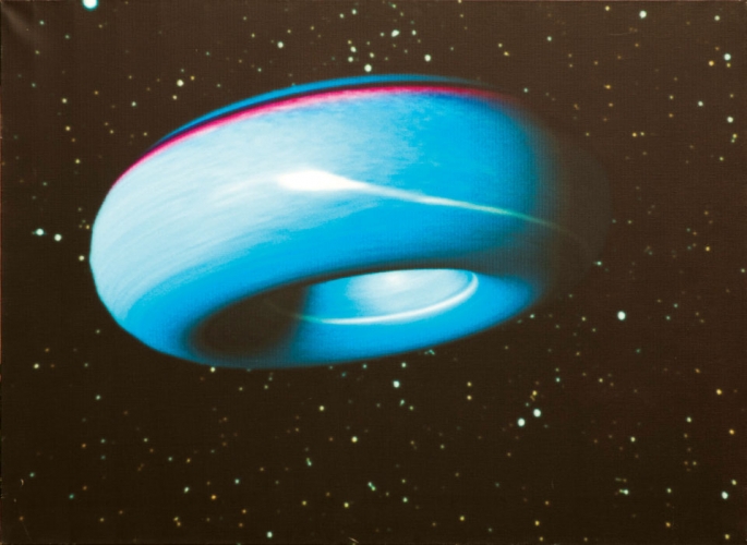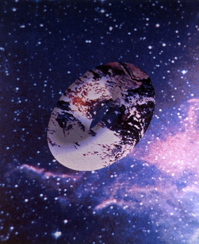 The artist next moved from mechanical grids to digital ones. Computer graphics enabled him to flatten and unpack Earth and other planets, to unfold their surfaces like skins and then to generate perforated volumes called Donuts, or elongated ones, the Sausages, which he assembled into compositions that sometimes suggest a kind of cosmic coitus or refer to canonical artworks (La Joie de vivre by Matisse for La Danse, 1995).