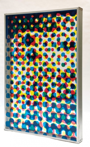 Jacquet’s involvement in “Mec ‘Art” (mechanical art) and the technical means at his disposal offer him almost endless possibilities: he can multiply variants, series, all forms of trames, all subjects and even all types of support – plastic, inflatable, Plexiglas, wood, fabrics… .etc. Jacquet rethinks the image as an industrial object, infinitely reproducible, undifferentiated, multiple … and unique by its very multiplicity.
