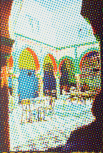 The work is thus fragmented, either by the points of the grid, or by its lines. The deformed lines of the frame streak the image or the picture; this technique, like that of enlarging the dots, is camouflage. Still, the original, original image is deconstructed to be restructured otherwise.t