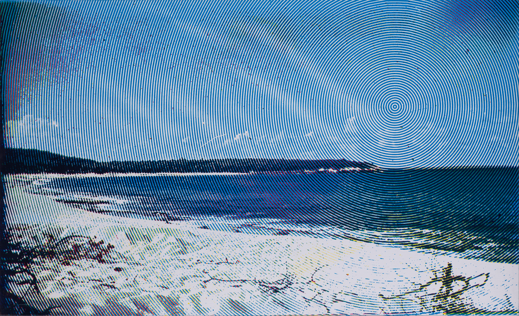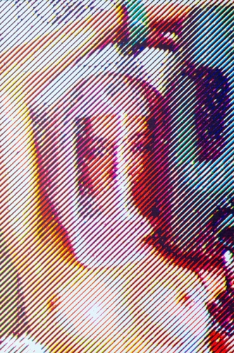 The work is thus fragmented, either by the points of the grid, or by its lines. The deformed lines of the frame streak the image or the picture; this technique, like that of enlarging the dots, is camouflage. Still, the original, original image is deconstructed to be restructured otherwise.