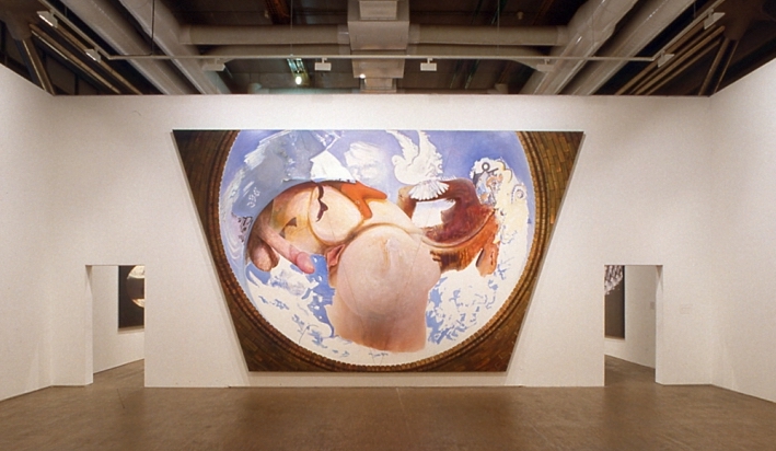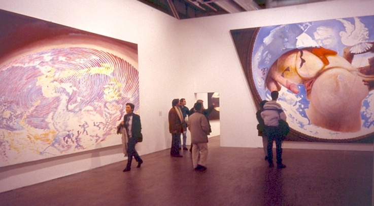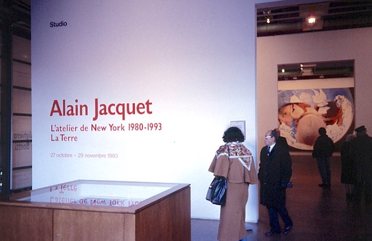 The exhibition confronts the hand-painted and machine-painted works that Jacquet has produced at the same time since 1981. After the serigraphic transfers of the works of the 1960s, he returned to the traditional oil technique by setting the equivalence of the painting by hand and painting with the computer, and exploits at ease the tricks that are nowadays authorized by high-tech processes. The works he then produced, such as Hot Dog, Le Bousier, La Vérité leaving the Well, are directly derived from The First Breakfast. In The Truth emerging from the Well, this earth rotated 180 ° is dilated, annihilated by a gigantic coital vision, the continents of Asia and Africa delimiting the contours of male and female figures.