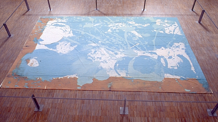 His last work produced for this exhibition, Pollock, Blowing Bubbles, is an a priori abstract painting whose surface, machine-painted, has the velvety quality of Renaissance painting. Gigantic evocation of an all-over by Pollock, it is, in fact, only the reproduction of a small wooden tablet which accidentally served as a support for a paint can. After having surveyed his entrails, Alain Jacquet today throws his probe into the vast field of repressed images. This work opens without doubt a new period, which remains for the time being a question mark.