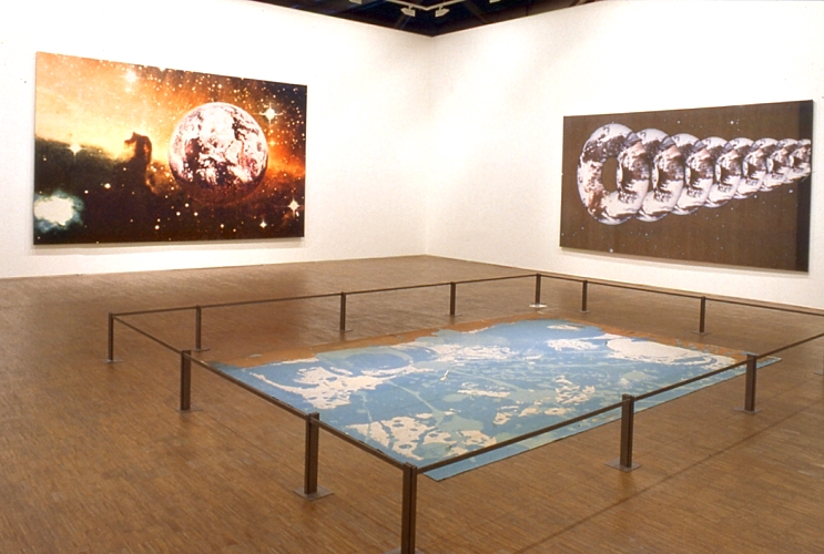 (…) In 1972, Jacquet returned to oil painting and began the “Land” period. This second period is introduced by a serigraphic report on canvas, repainted in oil, The First Breakfast, which shows an image of the earth taken by one of the astronauts of the Apollo space mission of 1969. (…) Alain Jacquet develops, from this satellite image and through the analysis of the constituent elements of the pivot image of this point-earth, a parasitic narration which feeds on the distortions that the interpretation makes the image undergo. By more or less underlined indications, the artist will reveal, according to the old precept described by Leonardo da Vinci, the drawing virtually inscribed in the spot, the face or the animal inscribed in the blurred outline of an ocean, and intersect surreptitiously, in the frame of the image, his personal experiences and fantasies. It is the sidereal distance, now made between the eye and the image, which allows the artist to reconstruct the vision by introducing the image in a “visionary” dimension. The image is formed by contamination, confusion of the visible and the vision. Jacquet superimposes the morbid precision of the fantasy image on the mechanical imprecision of the scientific image.